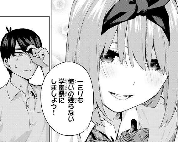 五つ子たちは2年の時は転入してすぐだったので、3年の今回は準備にも参加できてうれしそうです。これで大学の入試判定の結果が返ってこなければと、二乃は愚痴を言い風太郎と同じ大学に行く妄想をしますが、即座に否定されます。そして学園祭が終われば、いよいよ本格的に受験に突入かと呟きます。
