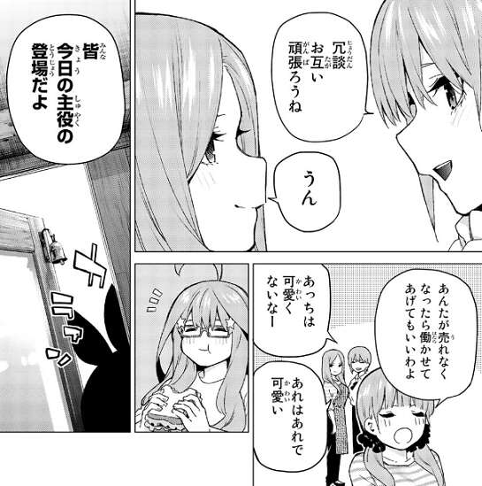 卒業式から五年後、一花が風太郎と四葉の結婚式の招待状を手に日本に帰国しています。四葉と風太郎の結婚式に向けて五つ子たちに集まっており、二乃と三玖が一緒にやっているお店に四葉以外のみんな集まっています。四人は自分達の近況で盛り上がっていると、結婚式の主役で新婦の四葉が登場します。じっとしていられなくて、うちから自転車で走ってきたと言い、四葉は全身汗だくです。