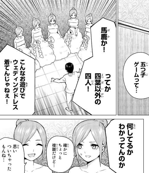 冒頭、風太郎は結婚披露宴の挨拶をしておりますが、式の前には五人から五つ子ゲーム ファイナルを挑まれていました。風太郎は四葉以外がお遊びでウェディングドレスを着ている事に怒ります。他の姉妹もちょっと複雑だけど…、思いついちゃったもんね…と言います。そしてこれはお遊びじゃないと言い、全員が私が花嫁本人だと主張し、五つ子ゲームをやめるつもりはありません。