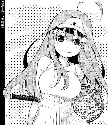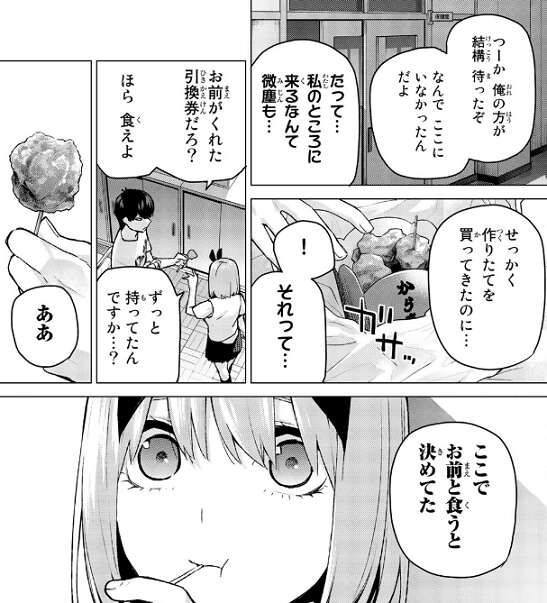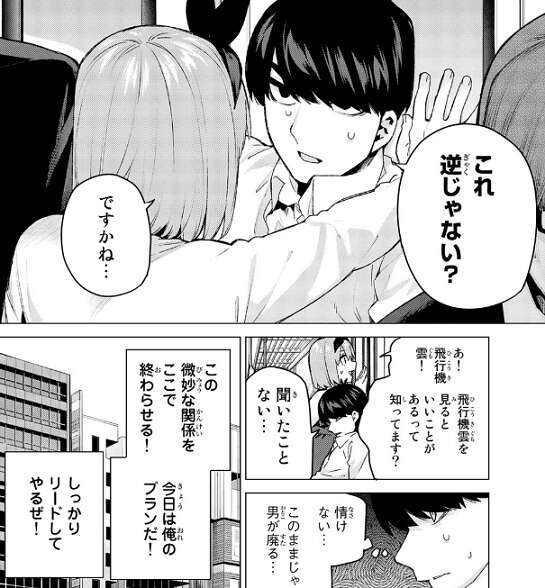 学園祭も終わり、風太郎は待ち合わせをしていますが、待ち合わせ相手は告白したはずの四葉ではなく一花でした。一花はお出かけ先でバトミントンを楽しんでいますが、運動が苦手な風太郎は息が上がっていて全然楽しんでいるように見えません。バトミントンの後、一花は四葉が俺のことを好きだと言ってくれた事を風太郎から聞きます。そして四葉からまだやらなくちゃいけないことがあります、と言われ風太郎と四葉はまだ付き合っていない事を、一花は風太郎から聞かされます。