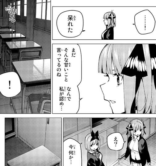 二乃と四葉は暗がりの教室で食堂での話し合いの続きを始めます。二乃は四葉のことがずっと疎ましかった、それまでずっと仲良くやってきたっていうのに、四葉は一人で何も言わず突っ走って、五つ子の輪を乱し始めたのは四葉あんたよ、と二乃は四葉を責めます。四葉は二乃から責められても言い訳せず謝り、私の願いは、私と上杉さんのお付き合いを認めてもらうこと、と正直に自分の願いを話しますが、二乃からまだそんな甘いこと言っているのね、呆れられます。
