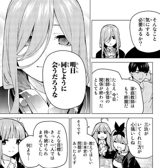 四葉とのデートで風太郎はプロポーズまでしてしまいましたが、高校では受験に向けて一花以外の四人に勉強を教えています。プロポーズまでした二人ですが、勉強を教えている時の二人は相変わらずの普段通りで二乃からつまらないと突っ込まれています。一方、三玖は受験しない立場なのに、ここにいていいのかと気にしますが、風太郎からそんなこと気にする必要ない、たとえ今日教師と生徒の関係が終わったとしても、明日同じように会うだろうな、と言われ三玖は笑顔になります。