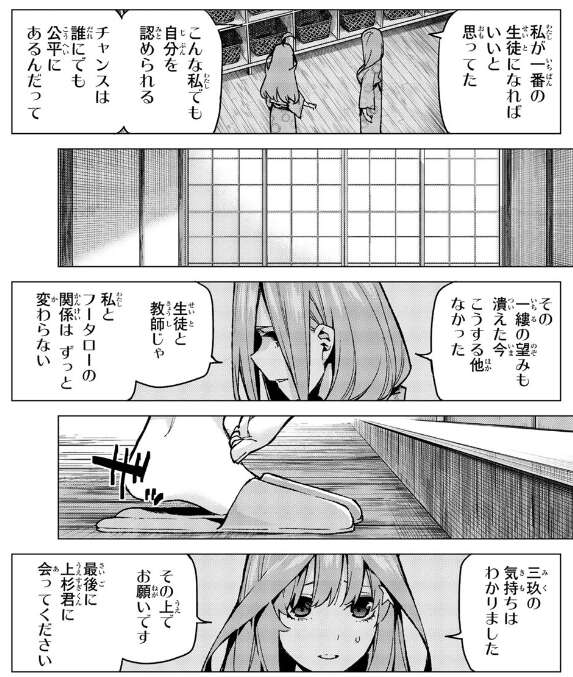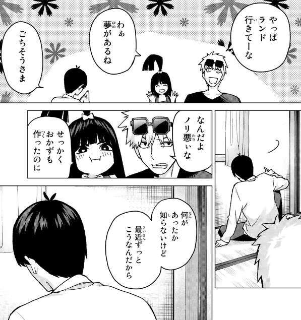 五月に呼び出され会いに行くと、五月にもうパートナーではないと言われて、五つ子の祖父からは孫に手を出すなと言われ混乱する風太郎ですが、まずは五月を探して旅館内を探します。やっと五月を見つけて追いかけますが、五つ子の父親に止められて五つ子の部屋に行けません。翌日、らいは経由で五月から電話があり何故か風太郎が五月に会いに行っていなかったことになっています。五月ともう一度会って話をすることになりますが、五つ子の父親の目がありなかなか抜け出せません。