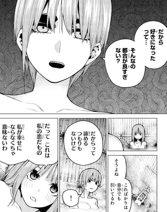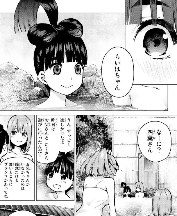 やっと風太郎は偽五月が三玖だと分かりましたが、またも場面は変わって結婚式当時の日に戻り指輪の交換の場面です。しかし何かトラブルがあり、誓いのキスに行きます。らいはが見守る中、誓いのキスが行われようとしましたが、再び現在に戻りらいはは二乃、四葉、五月と一緒に温泉に入っています。