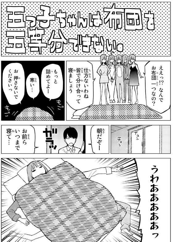 五つ子たちの為の布団が何故か、一つしか用意できていません。無理やり五人で寝た結果、風太郎が起こしに来た頃には、正体不明の生き物が…。