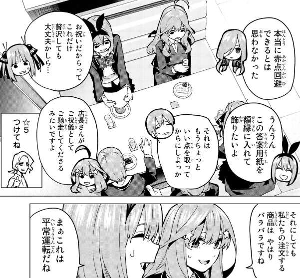 期末試験も終わり全員赤点回避出来ましたが、その直後二乃から好きだと告白されます。バイクで五つ子たちの打ち上げ場所に合流しますが、告白したにもかかわらず風太郎は全くの無反応に見えて、何も感じていないように見えます。風太郎もバイトに戻ってしまい後で聞くことにして、五つ子全員ケーキでお祝いです。