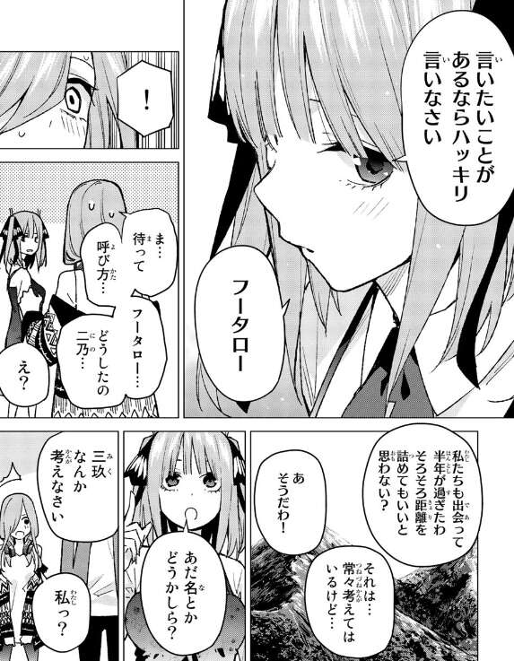 くじ引きで温泉旅行が当たり風太郎達は旅行に出かけますが、その旅行先で中野一家も旅行に来ていて、五つ子たちだけでなく中野パパとも再開します。五つ子たちと父親が旅行をしているのを見て、父親とは期末試験の時に仲が悪かったはずなのに今は、和解をしているように見えて風太郎は困惑します。風太郎の家庭教師としての立場も怪しかったので、一花や四葉に説明を求めますが何故か余所余所しい感じです。さらに二乃からあだ名をつけたらどうかと提案されて、三玖が「フー君」とあだ名を名付けます。
