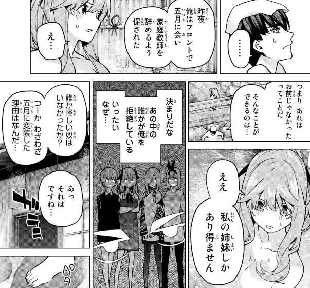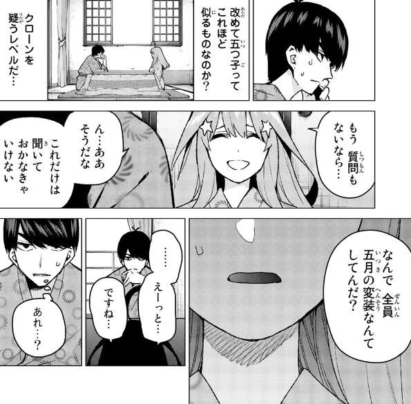 何故か五月の森となっている五つ子たちの部屋で、五つ子ゲームを挑まれます。早速、偽五月を特定すべく、五月以外の五つ子たちに質問を始めますが、風太郎には全然違いが分からずクローンかと疑い始めます。しかし、「なんで 全員五月の変装なんてしてんだ?」という質問をすると四人目の五月は、分かりやすい反応を見せ始めます。