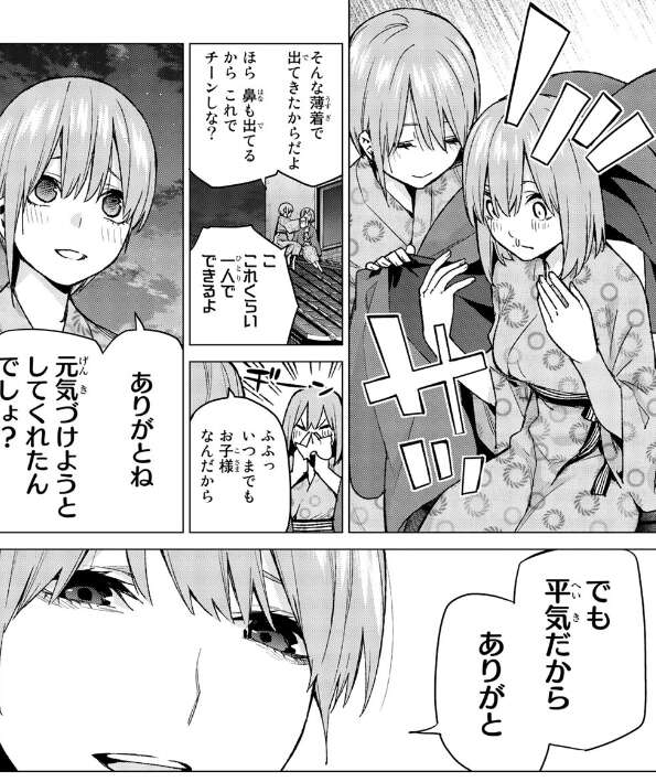 二乃から風太郎に告白すると言われ決意の固さに動揺し、つい泣いてしまった一花に四葉が声をかけ、屋根の上に誘います。四葉が心配して一花に話しかけてくれますが、くしゃみをして風邪を引きそうになり、お姉ちゃんらしく四葉に上着を着せます。やはり二乃との約束が気になり父親を追いかけようとしますが、四葉から無理していない?心配されます。