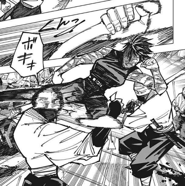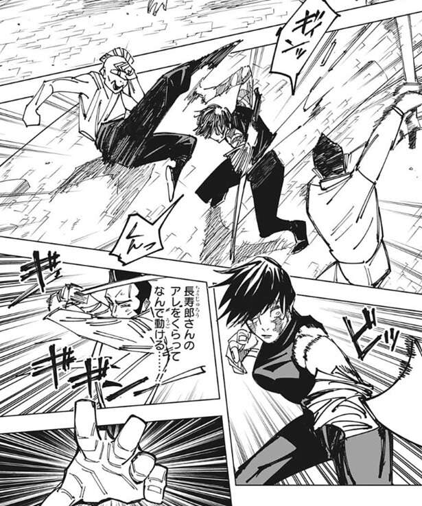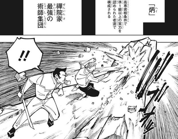 「炳」とは高専資格条件で準1級以上の実力を認められた者達で構成される、禪院家最強の呪術集団でした。しかし、この炳のメンバーの長寿郎の術式を喰らっても真希は止まらず、真希は強大な手から脱出します。