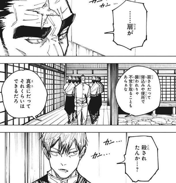 扇が殺された事に驚く甚壱と直哉ですが、躯倶留隊の隊長・禪院信朗は、寝込みや便所を襲われれば扇でも不覚を取られることもあると冷静で、躯倶留隊に、俺が着く前に引っ捕えろ、と命令を出します。そして、躯倶留隊は噸の間で正体不明の呪具を二振り持っている真希を発見、真希を取り囲みます。