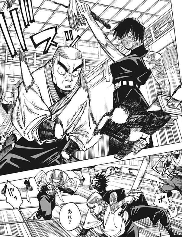 甚壱は蘭太にそのまま止めているように言い、真希を攻撃しようとしますが蘭太の術式が破られそうになります。さらに巨大な目が受けた傷は、そのまま蘭太自身にフィードバックされるようで、蘭太は目から血を吹き出します。蘭太の負傷を気にして甚壱は足を止めようとしますが、蘭太は、今の禪院家が在るのは甚爾さんの気まぐれだ!!気づいているだろ!!真希は今あの人と同じに成ったんだ!!と、叫び、今ここで真希を殺るように甚壱に叫びます。