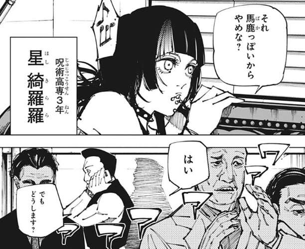 伏黒は引き続き警戒するように指示すると、秤は後で警備に綺羅羅も出すと言います。いい感じにザワつくぜ、こんなにザワつくのは元カレがリボ払いしまくってた時以来だ、と秤つぶやきますが、星綺羅羅は、元カレの話やめて、と文句を言います。