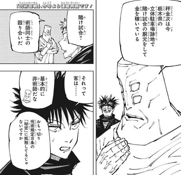 第152話までの禪院家の話が終わり、今回から新展開で停学中の3年生、秤金次の協力を得るために虎杖と伏黒が動きます。秤は今、栃木県の立体駐車場跡地で賭け試合の胴元(ボス)をして金を稼いでいるそうです。客は基本的に非術師のようで、思いっきり呪術規定8条の「秘密」に抵触していますが、秤は呪術規定を破っても気にしないようです。賭け試合の参加者には呪詛師もいるので、用心するように天元に言われ二人は立体駐車場跡地に向かいます。