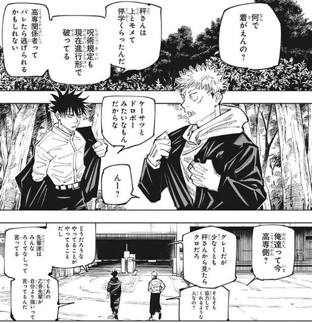 伏黒は虎杖に高専関係者と秤にバレたら逃げられるかもしれないと言い、着替えるように言います。虎杖は秤が協力してくれるような人なのか気にしますが、どうだろうなと伏黒は答えると、みんなろくでなしって言っていると言います。それでもあの乙骨先輩が自分より強いって言っているからと、伏黒は戦力として絶対に欲しいと虎杖に言います。そんな会話をしながら立体駐車場跡の建物に入ると、そこで男二人に止められます。男二人は見張りのようで回れ右するように虎杖と伏黒に言いますが、伏黒は金が要るから賭け試合に出場させてくれと言います。