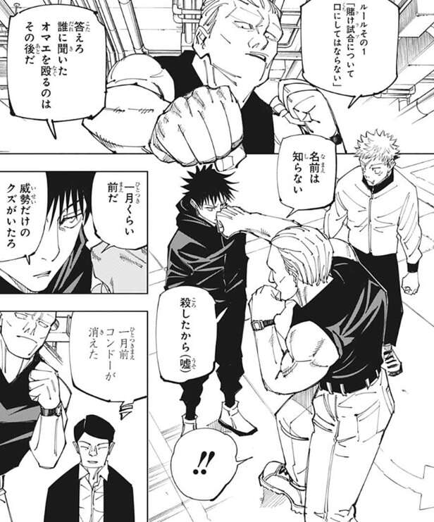 すると、一人の男の方が急に殴ってきますが、寸止めで拳を止めます。賭け試合のルールに「クラブについて口にしてはならない」というのがあるようで、男は伏黒に誰から聞いたか答えるように脅します。伏黒は、名前は知らない、殺したから(嘘)、一月くらい前だ、威勢だけの屑がいたろ、とハッタリをかましますが、一月前にコンドーという男が実際に消えていたようです。さらに伏黒がハッタリをかますと、ボスから許しが出たと言い、シード枠として賭け試合に出場させてもらえることになります。ただ、出場するのは伏黒でなく虎杖となり、伏黒は駆け引きをしつつ虎杖が賭け試合に出場する事を受け入れます。