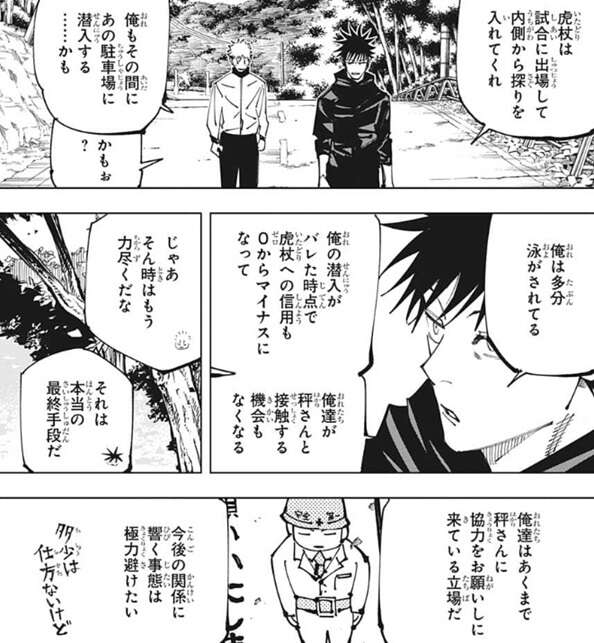 賭け試合の出場の約束を取り付けた虎杖と伏黒は、一度立体駐車場の建物を出ます。立体駐車場跡の外を歩きながら、虎杖と伏黒は防犯カメラから高確率で秤に見られていたことを話します。そして、虎杖が賭け試合に出て内側から探りを入れている間に、伏黒は駐車場に潜入するかもと虎杖に話します。伏黒は、俺は多分泳がされていると言い、もし潜入がバレた時点で虎杖への信用も0からマイナスになり秤と接触する機会もなくなる、と言います。そうなったら力尽くの最終手段になりますが、二人はあくまで秤に協力をお願いしに来ている立場なので、伏黒は今後の関係に響く事態は極力避けたいと言います。本当なら今晩は動くべきでないと伏黒は言いますが、津美紀の死滅回游への宣誓期限までの時間を考えると、伏黒は時間を無駄にしたくないと考えていて、だから今晩潜入して秤を探る、ヤバそうならすぐに退く、と虎杖に事情を説明します。