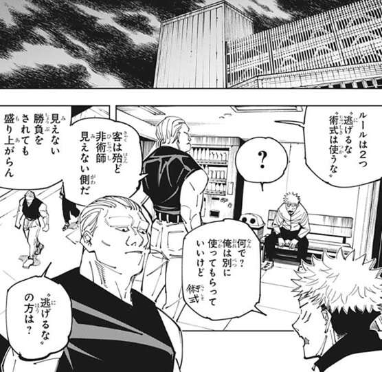 賭け試合の時間となり、虎杖は見張りの男から賭け試合のルールを聞かされます。ルールは二つで、“逃げるな”と“術式を使うな”です。客の殆どは非術師で術式を使われても見えないので、見えない勝負をされても盛り上がらないと言われます。