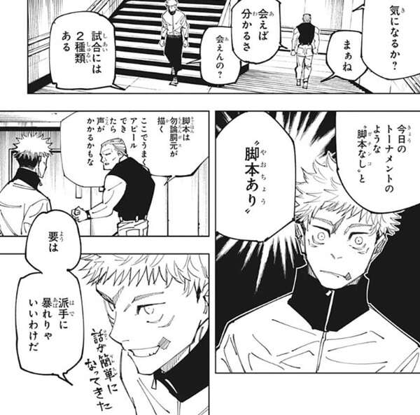 “逃げるな”も“客の見える範囲で戦え”という指示で、客の為のルールです。虎杖がボスってどんな人と聞くと、男は会えば分かるさと答えます。賭け試合には2種類あり、今日のトーナメントのような“脚本なし(ガチンコ)”と“脚本あり(やおちょう)”で、脚本はボスが描くのでうまくアピールできれば声がかかるかも、と男から言われます。要は派手に暴れればいいと分かり、虎杖はやる気を出します。
