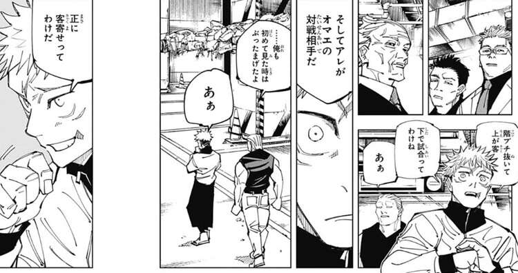 賭け試合の会場は、フロアをブチ抜いてあって上のフロアに客がいて下のフロアで試合を行います。そして虎杖の対戦相手も現れますが、虎杖は対戦相手を見て、正に客寄せってわけだ、とつぶやきます。その後、賭け試合の実況が本日の対戦カードを紹介します。