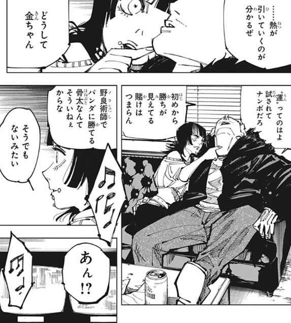 虎杖とパンダの紹介が終わり、客がどちらに賭けるかを考えている時、秤ともう一人の3年生、星綺羅羅がモニタールームで様子を見ていました。秤は熱が引いていくのが分かると言い、“運”ってのはよ、試されてナンボだろ、初めから価値が見えている賭けはつまらん、とつぶやきます。野良術師でパンダに勝てる骨太はそういないから、勝負は見えていると秤は考えているようですが、そうでもないみたい、と星綺羅羅は言います。
