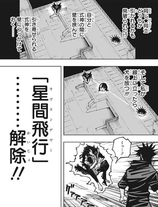 伏黒は玉犬を一度も解除していなかったようで、玉犬を壁にひっかけておいて、星綺羅羅が伏黒と玉犬の線上に立ったら、壁に引っかかっている玉犬を放つように伏黒は仕組んでいたようです。伏黒が同じ★同士、どちらに引っ張られるかも見破られた!?と、星綺羅羅は一瞬混乱しますが、そんな考えをしている内に玉犬と一緒に星綺羅羅は伏黒に向かって引っ張られていきます。このままだと、星綺羅羅と玉犬は伏黒と衝突してしまうので、星綺羅羅はその前に術式「星間飛行(ラヴランデヴー)」を解除、星綺羅羅は伏黒に拘束されてしまいます。その後伏黒は、話聞いてください、と星綺羅羅に頼みます。