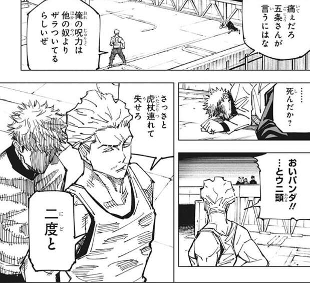 秤は五条から、秤の呪力は他の奴よりザラついている、と言われたことがあるようで、秤の打撃はかなり痛いようです。秤は虎杖が気絶したと思ったようで、パンダと伏黒に虎杖を連れて失せるように言います。しかし虎杖はまたもすぐに立ち上がり、秤の背後へと移動しますが、やはり反撃はしません。