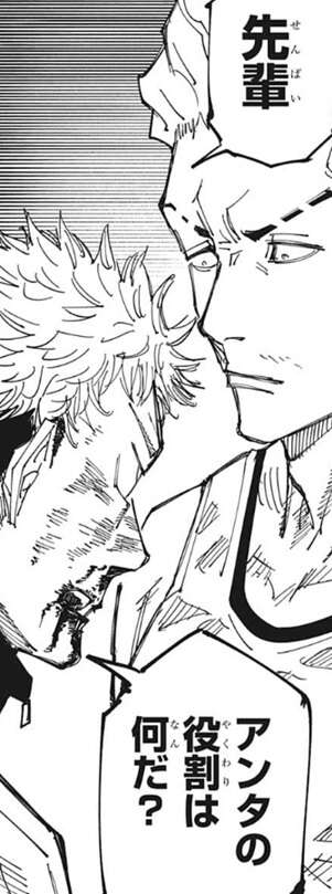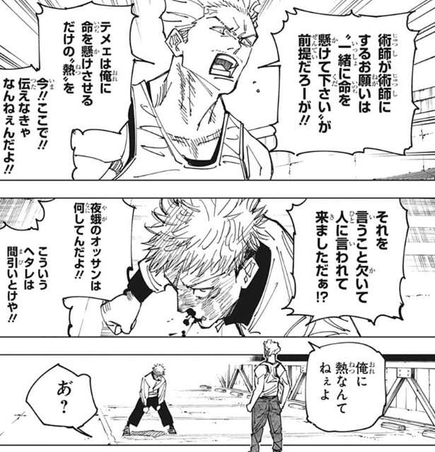 秤は虎杖が人に言われてき事が気にくわないようで、術師なら一緒に命を懸けて欲しいが前提で、虎杖は秤に命を懸けさせるだけの“熱”を今、ここで、伝えなければいけないと秤は言います。しかし虎杖は自分に熱などなく、自分は術師が呪いを祓うため、払い続けるための部品だと秤に答えます。