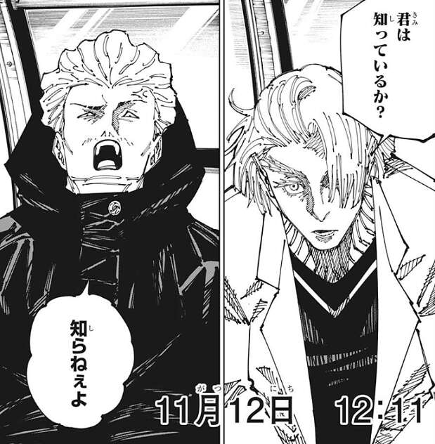ここであらためて、シャルル・ベルナールが死滅回游のプレイヤーだと文章で描かれます。飛び出したシャルル・ベルナールは、一体なんなのだ……、漫画とは……、漫画家とは……、と自問自答します。そして時間は、11月12日 12時11分に移り、シャルル・ベルナールはその答えを秤金次に問いかけますが、秤金次は知らねぇよ、と返事をします。