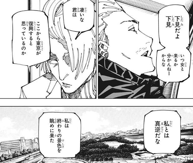 シャルル・ベルナールは秤金次と観覧車に乗っていて、秤金次は女と来た時のために下見として観覧車に乗っていました。しかし、いつ女と来るか分からないと秤金次が言うと、ここから東京が復興すると思っているのか、と返事をします。シャルル・ベルナールは観覧車に終わりの景色を眺めに来ていたようで、東京に呪霊が溢れてからあらゆる媒体から漫画は発信されていない、多くの作家も編集者もつまりはそういうことなんだろう、と思い詰めたように秤金次に言います。