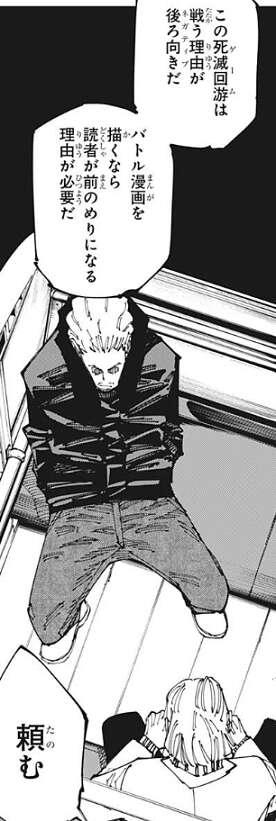 そして、シャルル・ベルナールは秤金次に戦う理由をくれ、と言います。この死滅回游は戦う理由がネガティブで、バトル漫画を描くなら読者が前のめりになる理由が必要だ、とシャルル・ベルナールは言い、殺したい程君が憎いと、そう思わせてくれ、と秤金次に頼みます。