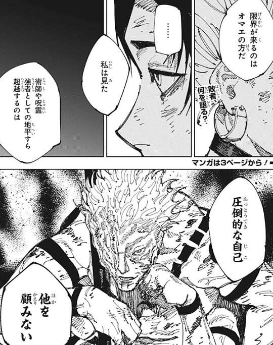 180話で乙骨にやられた石流でしたが、石流は乙骨に、限界が来るのはオマエ方だ、と語っています。術師や呪霊、強者としての地平すら超越するのは、圧倒的な自己、他を顧みない災い、と石流は乙骨に言いますが、この時のカットは宿儺のようです。ただ、これまでの宿儺とは姿が異なります…、いつの頃の宿儺でしょうか?
