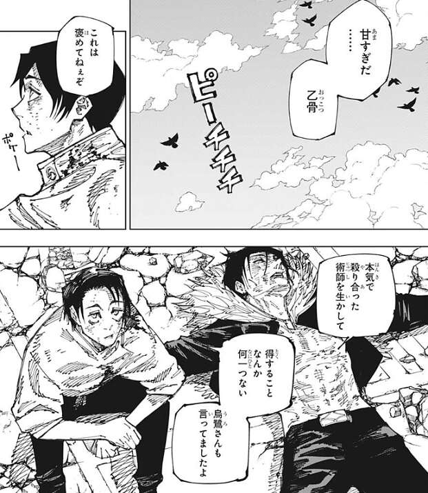 甘すぎだ…乙骨、これは褒めてねぇぞ、と石流は続けますが、乙骨はポケーとした表情で、気が抜けています。乙骨は烏鷺が、本気で殺り合った術師を生かして、得することなんか何一つない、と言っていたと言うと、烏鷺が生きている事に石流が反応しますが、領域展開後のグラニテブラストならそんなもんか、と納得します。
