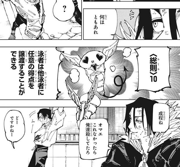 会話がひと段落着いた後、乙骨が石流にポイントください、と言いますが、石流は最初何のことか分かりません。しかし、コガネが総則10の追加をアナウンスすると、オマエこれなかったら俺達殺してたろ、と石流は納得します。