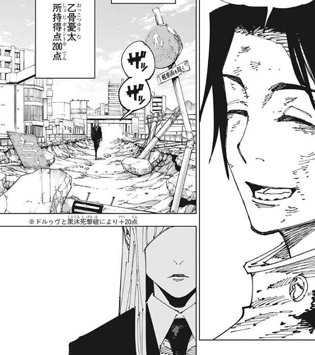 石流の問いに、どーですかねー、と乙骨はぐらかしつつ、僕の仲間に感謝して下さい、と笑顔で乙骨は答えます。これで乙骨は烏鷺享子と石流龍からのポイント譲渡により、所持ポイントが190点(作中の「所持得点200点」は誤りだそうです、「所持得点190点」が正しいそうです)となります。一方、三輪が歩いているカットがここで突然、挿入されます。