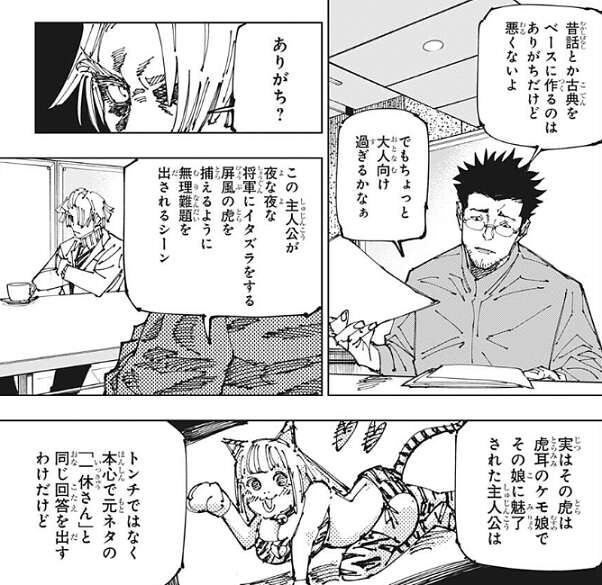 編集者はシャルル・ベルナールを変わった子だと感じつつ、シャルル・ベルナールが持ち込んだ漫画の内容へと会話が移ります。漫画の内容は一休さんの内容が元ネタのようですが、編集者は、昔ばなしとか個展をベースに作るのはありがちだけど悪くないよ、でもちょっと大人向けすぎるかなぁ、と週刊少年ジャンプには合っていないようなことを言います。漫画の内容も分かりづらいと批評し、この後の展開もコメディ?ホラー?ジャンルを複合するには話の軸が弱いよ、とダメ出しします。