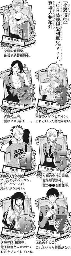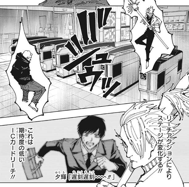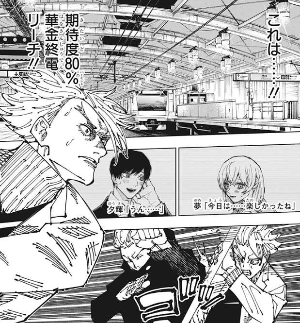秤が領域展開「坐殺博徒」を使用し、シャルルの脳内には秤の領域と術式のルールが流れる…、はずですが、シャルルの脳内にまず流れたのは、“CR私鉄純愛列車”の登場人物紹介でした。