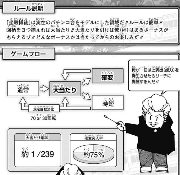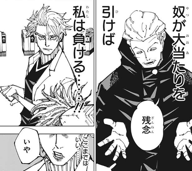 秤の領域展開ですが、ギャンブルに関係しそうとはおもっていましたが、まさかのパチンコそのものでした。秤の術式や領域のルールもパチンコのルールそのもので、シャルルが、私の脳にゴミのような情報を流すんじゃなぁい!!!と、怒ったのも分かる気がします。18巻で星綺羅羅が、秤は上の保守派と揉めたと言ってしましたが、こんなギャンブル術式を使ってたら揉めるのも分かる気がします。