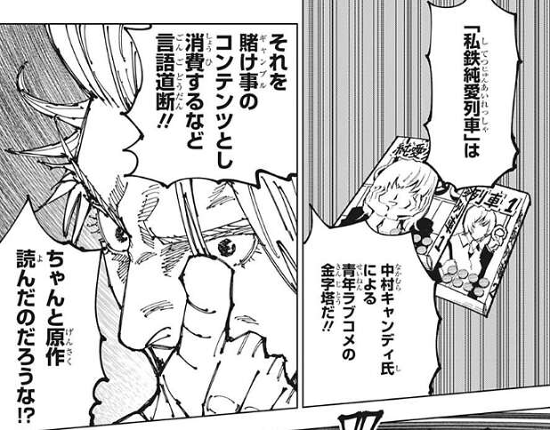 秤の領域と術式のルールを理解したシャルルですが、秤に対して作品を冒涜するなとシャルルは突然、激怒します。“CR私鉄純愛列車”は中村キャンディによる青年ラブコメ漫画で、それをギャンブルのコンテンツとし消費している事に、シャルルは激怒します。シャルルは秤に対して、ちゃんと原作を読んだのだろうな!?と、怒ります。