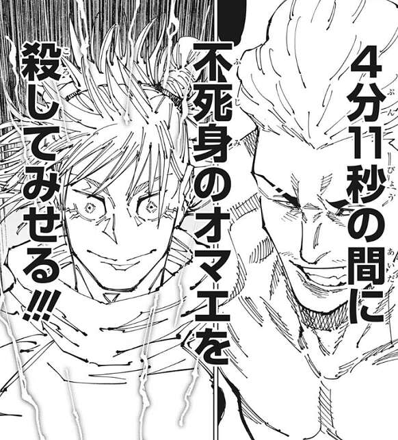 4分11秒の間に不死身のオマエを殺してみせる!!!と、鹿紫雲一は決意すると、呪力が溢れ続ける秤に挑みます。