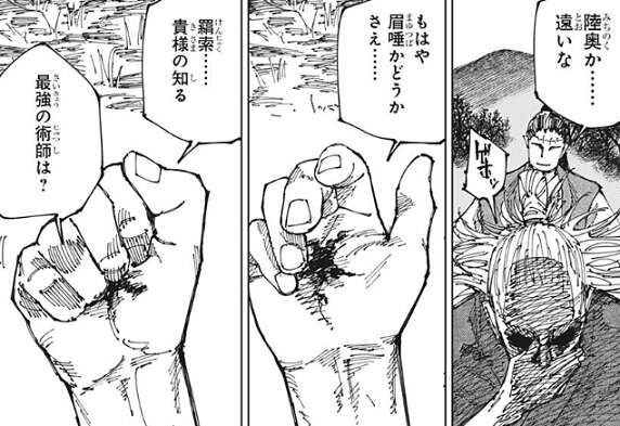 羂索は、陸奥に面白いのがいるらしい、伊達藩で歴代一の呪力出力だそうだ、と言いますが、鹿紫雲一は、陸奥か……遠いな、と答えます。この伊達藩で歴代一の呪力出力というのは、仙台コロニーにいた石流龍の事のようです。鹿紫雲一が咳をするとその咳には血が混じっています。この時の鹿紫雲一はかなり年を取っていてあまり長くは生きれないので、陸奥まで行くのは無理そうです。