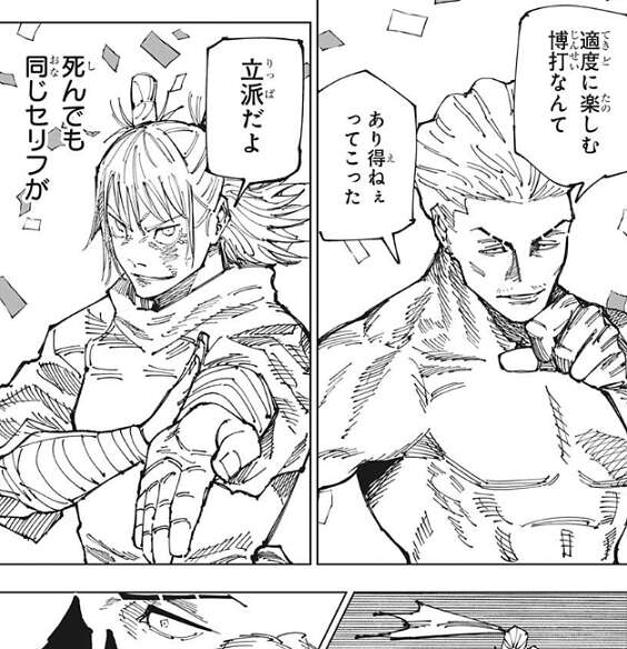 鹿紫雲一は羂索に、貴様の知る最強の術師は?と、質問すると、宿儺だ、600年前で申し訳ないがこれは譲れない、と羂索は答えます。400年前の鹿紫雲一は羂索の答えを聞くと、例の話甘んじて受けよう、さすれば、宿儺と戦れるのだな、と言うと、身体に稲妻のような呪力が走ります。
