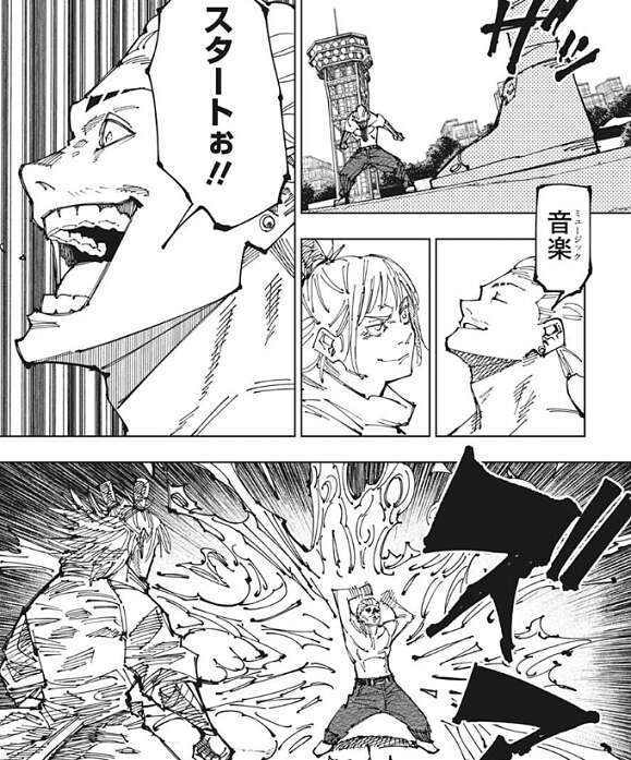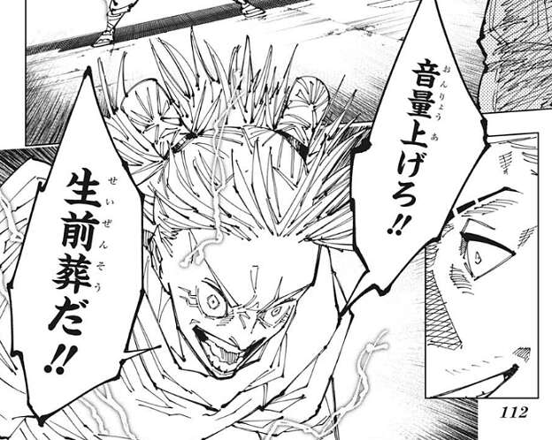 鹿紫雲一は稲妻のような呪力を体から放つと、音量上げろ!!生前葬だ!!と、秤に叫びます。
