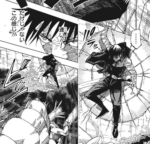 真希は呪霊に体当たりされ、壁に激突します。真希は体当たりしてきた呪霊を殴ろうとしますが、呪霊は再び超スピードで移動すると真希のパンチをかわし、真希を突き飛ばします。