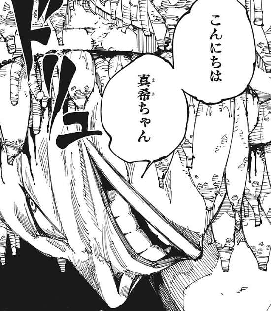 呪霊は体を真希にぶつけ、真希は呪霊と壁に挟まれて身動きがとれなくなります。すると、今度は呪霊の体から人の顔が出てきます。呪霊は真希に、こんにちは、真希ちゃん、と話しかけます。