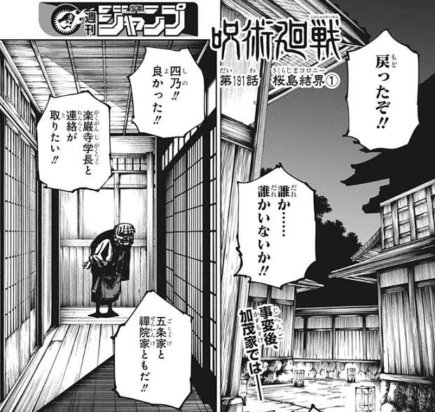 時間が少し戻って11月3日 23時5分、京都の加茂宗家屋敷に到着した加茂憲紀は、楽巌寺学長、五条家、禪院家と連絡が取りたい、と加茂家の人間・四乃に伝えます。