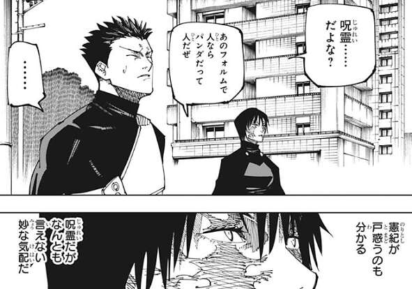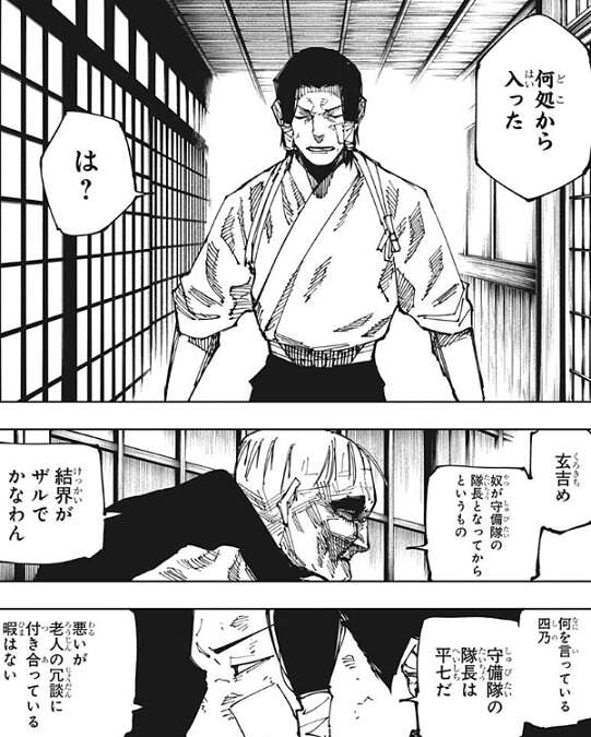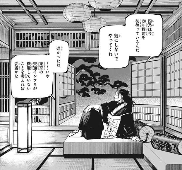 四乃の様子がおかしいことに気付き、加茂憲紀は別の部屋に行きますが、そこには羂索が座っていました。羂索は、四乃は今150年程前を彷徨っていると言い、加茂憲紀には、遅かったね、……いや東京の交通インフラが機能していないことを考えれば妥当かな、と話しかけます。