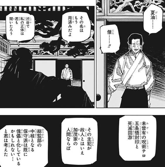 加茂宗家屋敷に夏油傑=羂索がいる事に加茂憲紀は驚きます。しかし羂索は平然とした態度のまま、加茂憲紀は保守派の中でも発言力を持ち信用に足る楽巌寺学長に嘆願し、総監部からの通達を取り下げようとした、と加茂憲紀が加茂宗家に来た理由を言い当てます。