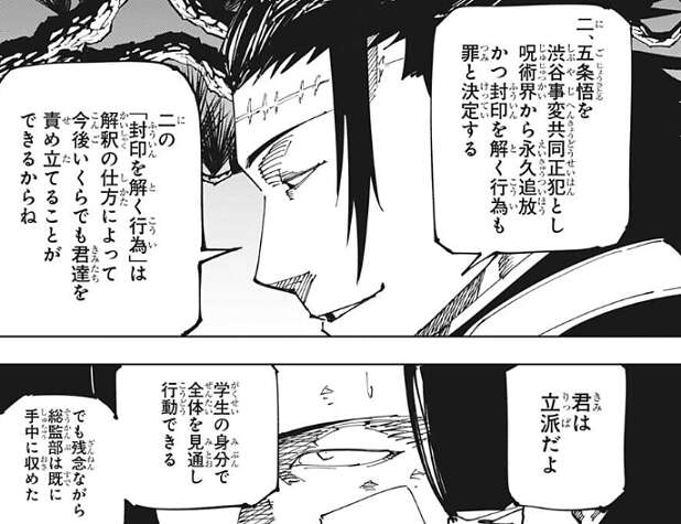 総監部からの通達の中にある「五条悟の封印を解く行為」は解釈の仕方によって、今後加茂憲敏達を責め立てることができる、だから加茂憲紀は総監部からの通達を取り下げようとしたのですが、加茂憲紀が学生の身分で全体を見通し行動できる、と羂索は褒めます。結局、羂索は総監部を既に手中に収めていて、夏油傑の死刑を推した者、虎杖の処刑に乙骨を挙げた者を始末していました。さらに、保守派の母体加茂家の25代目当主には羂索がなっていて、此処に君の居場所はない、と加茂憲紀に言います。