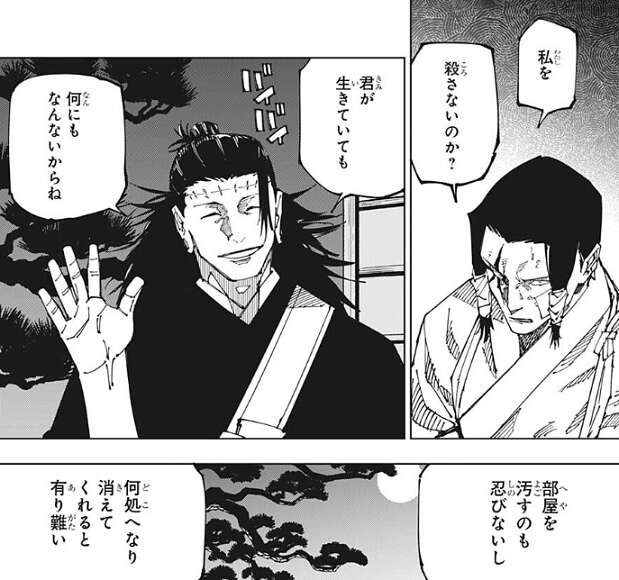その言葉を聞いて加茂憲紀は羂索が自分を殺そうとしていると思い、戦闘態勢をとりますが、羂索は加茂憲紀が生きていても何もできないと思っているようで、加茂憲紀は殺そうとしません。何処へなりと消えてくれると有り難い、と加茂憲紀に羂索は言い、加茂憲倫は仕方なく京都の加茂家を去ります。